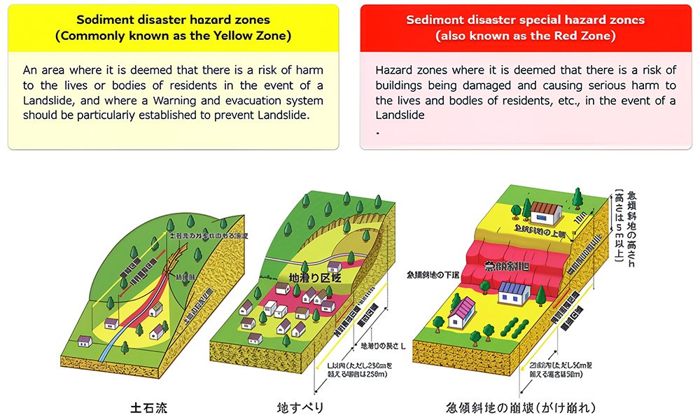 Yellow zones indicate landslide risk; red zones mark areas with extreme danger. Properties here may face restrictions, high insurance costs, or mandatory evacuation during disasters, creating serious ownership challenges.